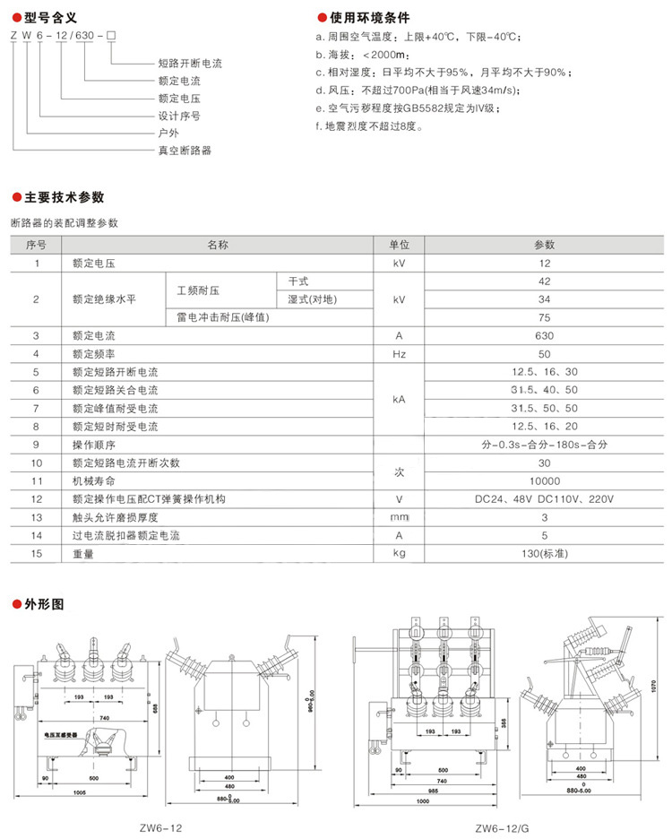 ZW6-12型戶外高壓真空斷路器(以下簡稱斷路器),是三相交流50Hz、12kV的戶外高壓配電設備,用于開斷、關合電力系統中的負荷電流、過載電流和短路電流,更適用于頻繁操作的場所。斷路器配用CT23彈簧操動機構,可實現電動儲能、電動分合閘,也可手動儲能和手動分合閘。根據用戶需要,斷路器可內裝100/5、200/5、400/5及600/5的電流互感器。內置JSZR-10W干式電壓互感器,加裝一次熔斷器保護,實現自備操作電源,也為配備各種重合器或遠動終端提供操作電源。配套合適的控制系統,可作為重合器或分段器,是城鄉電網無油化改造的首選產品。