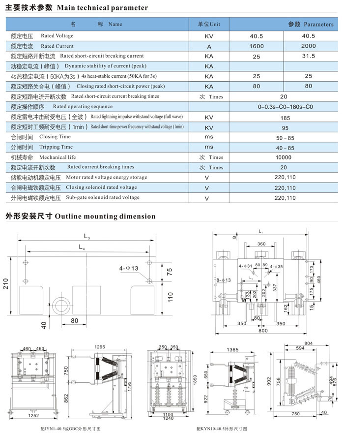 ZN12-40.5/1250-31.5主要技術參數